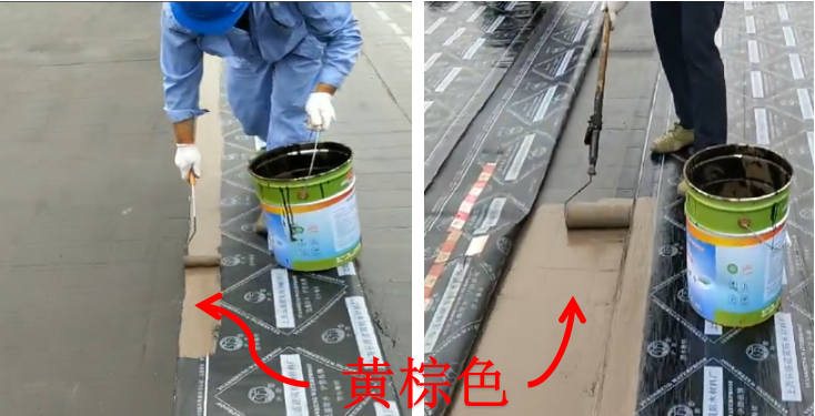 貼必粘在基面上剛開始涂刷時(shí)呈黃棕色,氣溫高時(shí)5-15分鐘即變成黑色(氣溫低時(shí)要30-45分鐘),此時(shí)用手指去輕按黑色涂膜,手感有粘性但不會(huì)粘附于手指上,此時(shí)即可將卷材于基面進(jìn)行粘貼(如圖)。