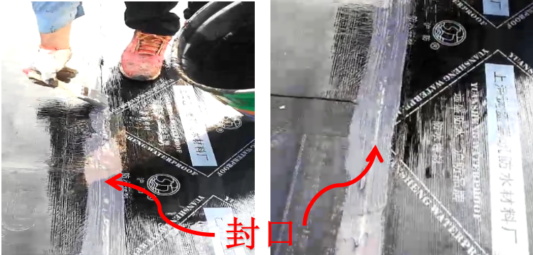 卷材鋪貼后,堅(jiān)持當(dāng)天鋪貼的卷材必須當(dāng)天把所鋪卷材長邊和短邊的外露邊口處進(jìn)行密封,采用卷材邊口專用密封膠對(duì)卷材的外露邊口縫及端頭處進(jìn)行涂刷密封密實(shí),不漏刷即可。