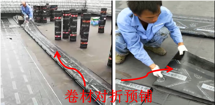 在處理好的基面上,先將瀝青類卷材按鋪貼順序(注意:長邊搭接8cm,短邊搭接10cm)進(jìn)行大面積預(yù)鋪,然后將每卷卷材對(duì)折翻揭覆鋪(如圖)。