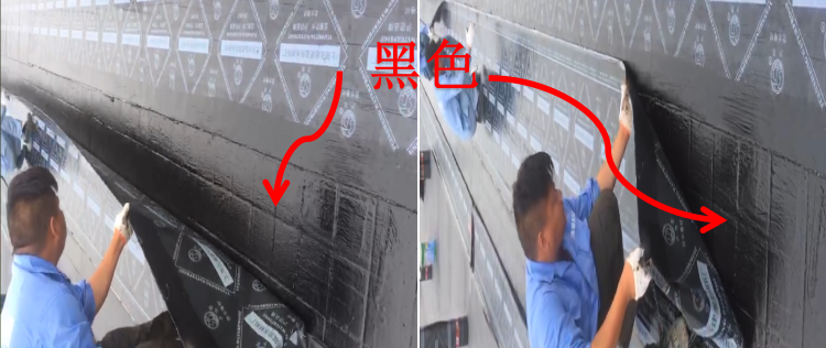貼必粘在基面上剛開始涂刷時(shí)呈黃棕色,氣溫高時(shí)5-15分鐘即變成黑色(氣溫低時(shí)要30-45分鐘),此時(shí)用手指去輕按黑色涂膜,手感有粘性但不會(huì)粘附于手指上,此時(shí)即可將卷材于基面進(jìn)行粘貼(如圖)。